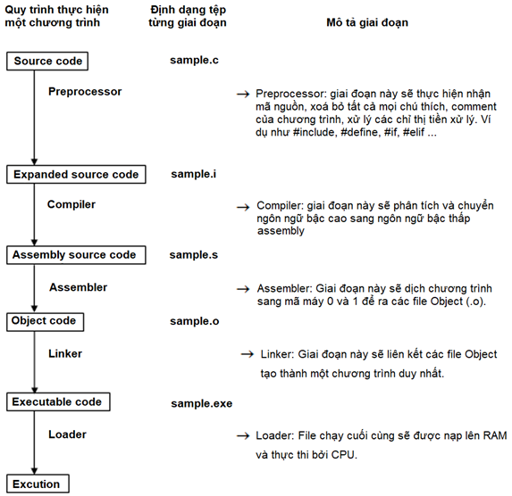 Máy tính chỉ hiểu ngôn ngữ máy (0 và 1). Quy trình chuyển đổi từ mã nguồn C sang tệp thực thi bao gồm 5 giai đoạn chính: